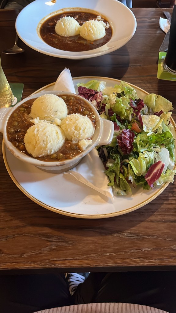 Bebimos mucha Guiness, que es mi cerveza favorita. Comimos mucho. No es que tengan una gastronomía característica, pero si que tienen una especie de guiso de ternera con Guiness y conseguí encontrarlo en versión vegan. Que eran unas lentejas con puré de patata, pero bueno 😆.