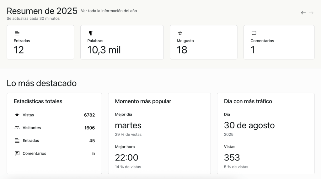 Ni idea de quienes me leen, porque solo tengo constancia de 2-3 personas reales, pero bueno. Gracias a ellos y a los demás 😆🤗. Obviamente ahí hay visitas duplicadas, algún bot… pero eso. Que gracias. Estos siguientes años van por ustedes 🙇🏻♀️